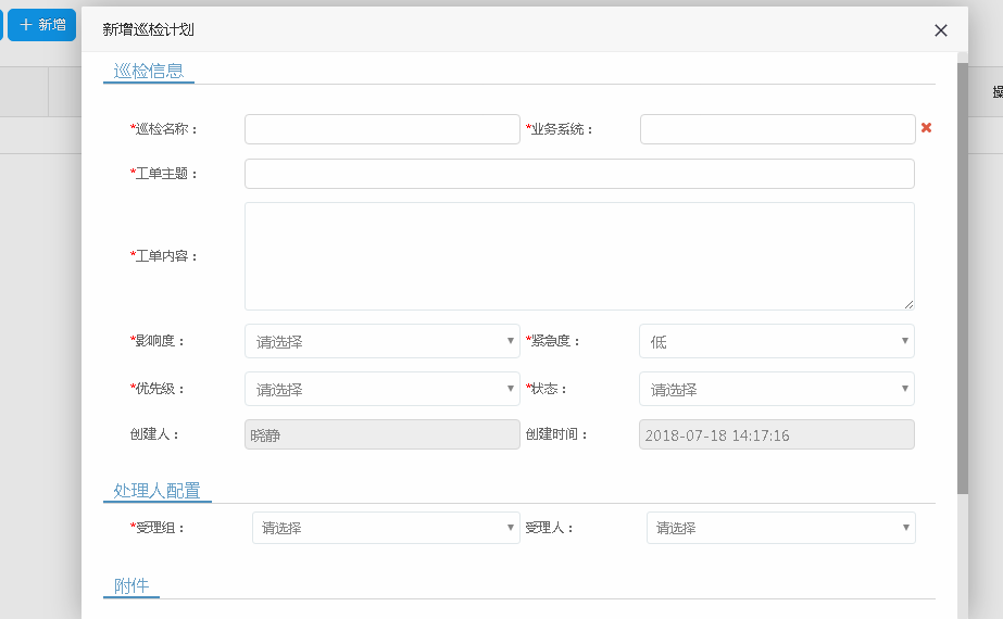點(diǎn)擊新增 按鈕,在新增頁面中填寫巡檢信息、處理人配置及相關(guān)附件,并點(diǎn)擊保存 按鈕完成新增。