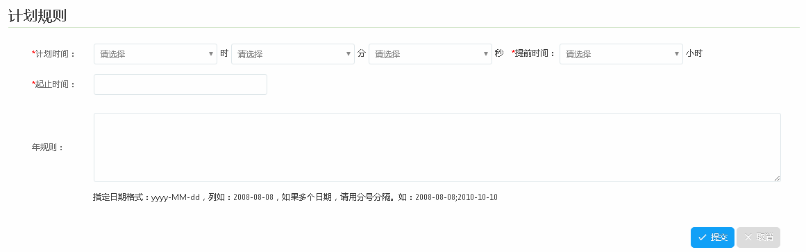 自定義:自定義是為支持多個(gè)無規(guī)則時(shí)間點(diǎn)的觸發(fā)產(chǎn)生。通過對多個(gè)時(shí)間點(diǎn)以分號(hào)分割進(jìn)行 定義。例:指定日期格式:yyyy-MM-dd,列如:2008-08-08,如果多個(gè)日期,請用分號(hào)分隔。