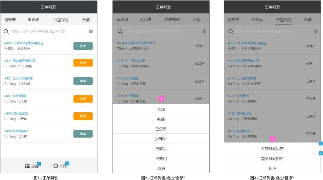 根據(jù)狀態(tài)篩選——結(jié)合上面所選的欄目,例如“抄送我的”,則根據(jù)工單狀態(tài)篩選抄送我的 列表內(nèi)的工單。