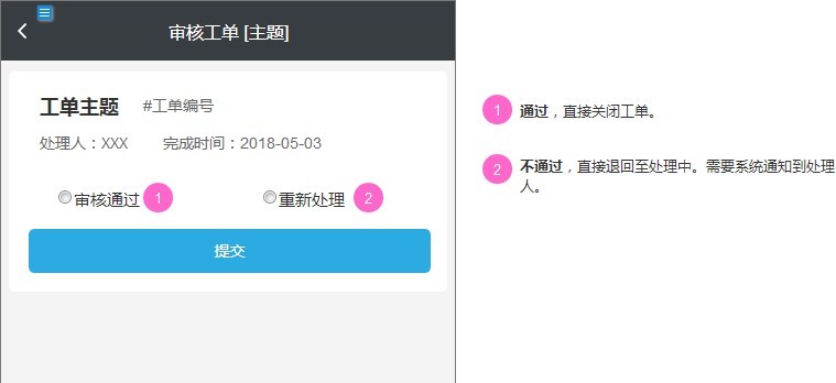 處理人處理完工單,提交人審核工單,判斷問題是否解決,確認(rèn)審核通過將關(guān)閉工單,選 擇重新處理,工單直接退回處理中,相關(guān)人員都會收到系統(tǒng)通知。