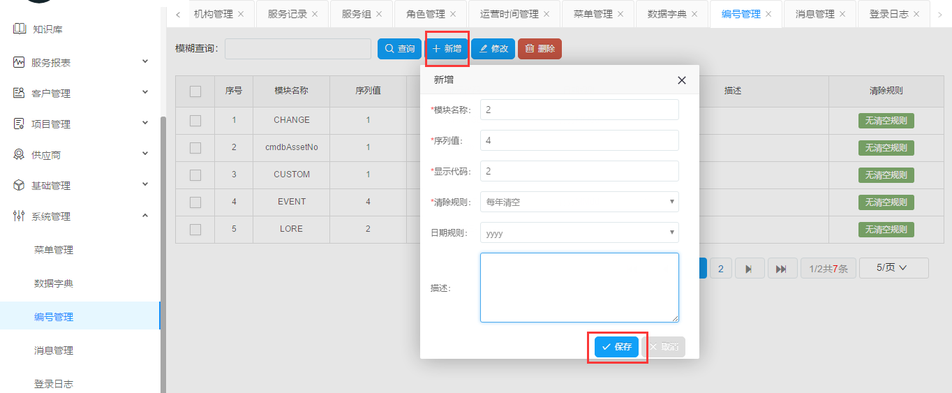 點擊新增按鈕,新增編號,企業(yè)根據(jù)實際情況填寫完成點擊“保存”即可