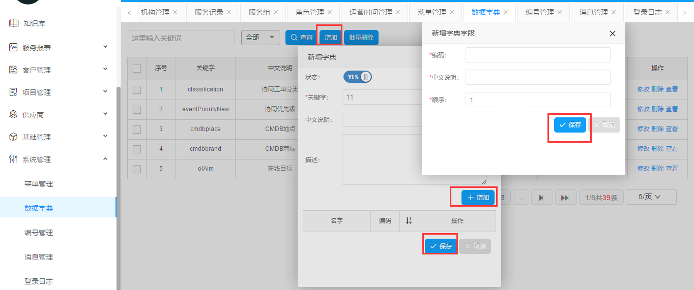 點擊增加按鈕,新增字典字段,填寫完成點擊“保存”即可