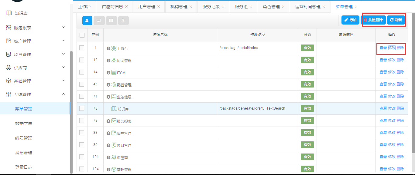 選中目錄,點擊右側(cè)的功能按鈕,可以對菜單進行查看、修改、刪除以及批量刪除等操作