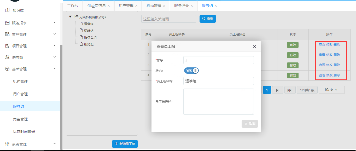 樹下面選擇指定員工組,點擊右側的操作按鈕對員工組進行查看、修改、刪除等操作