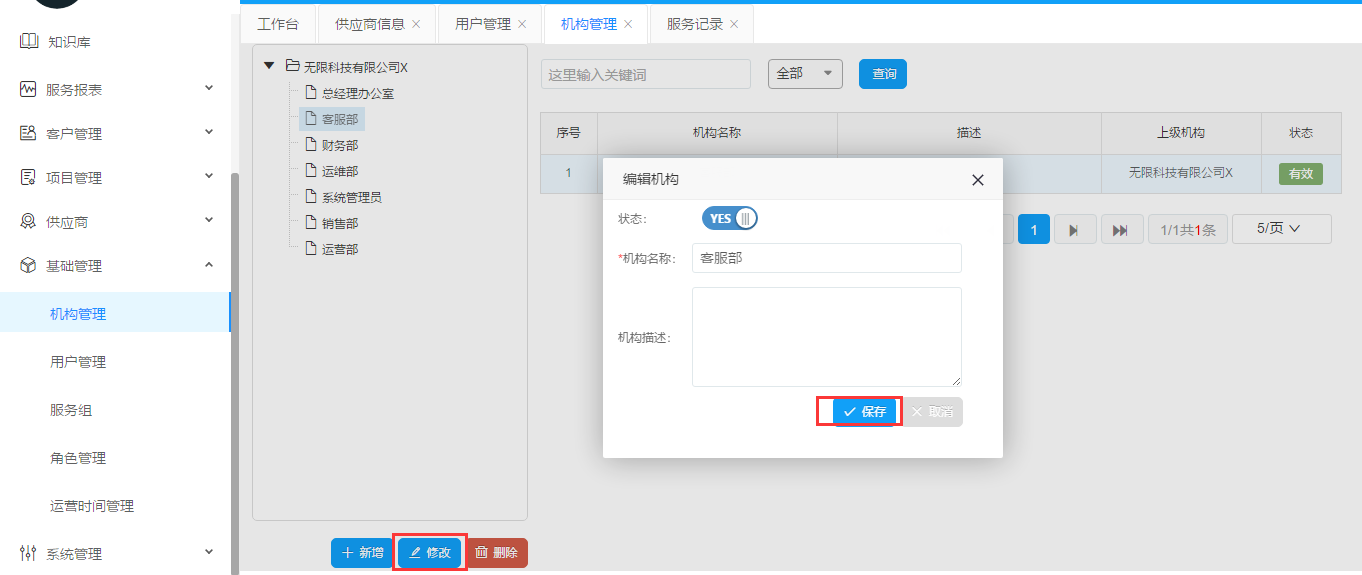 選擇一個機構,點擊修改。彈出對話框之后修改表單元素,如果確認點擊保存,放棄點擊取消