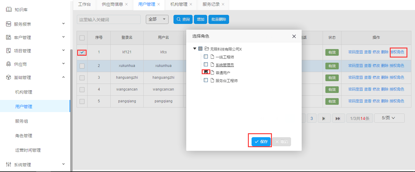 選擇一個用戶,點擊授權角色。彈出對話框之后勾選需要授權的角色,如果確認點擊保存,放棄點擊取消