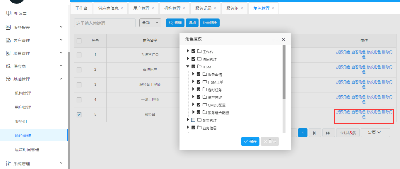 選擇一個角色,點擊右側功能按鈕,可進行授權、查看、修改、刪除角色等操作,放棄點擊取消
