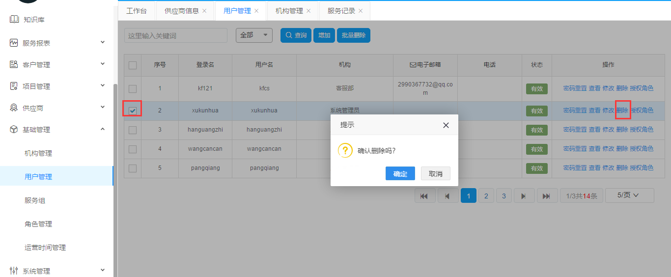 選擇一個用戶,點擊刪除。彈出對話框之后如果確認點擊確定,放棄點擊取消