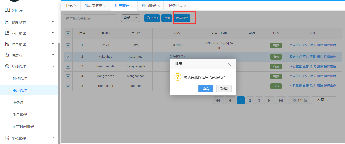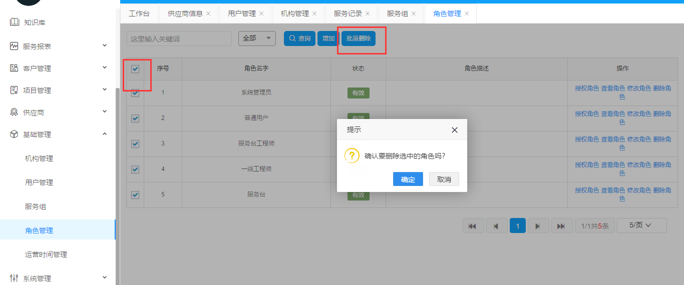 勾選角色列表最前面的復選框(勾選左上角的為全選),點擊批量刪除。彈出對話框之后如果確認點擊確定,放棄點擊取消