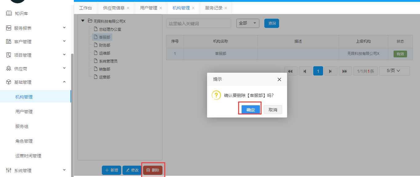 選擇一個機構,點擊刪除。彈出對話框之后如果確認點擊保存,放棄點擊取消