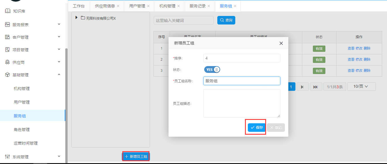 點擊新增員工組。彈出對話框之后填寫排序,員工組名稱,如果確認點擊保存,放棄點擊取消