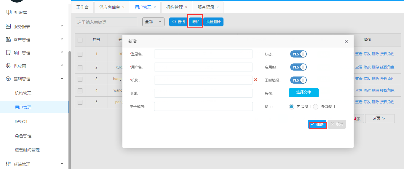 點擊增加。彈出對話框之后填寫登錄名,選擇機構。建議您填寫用戶名,電話和電子郵箱。如果確認點擊保存,放棄點擊取消