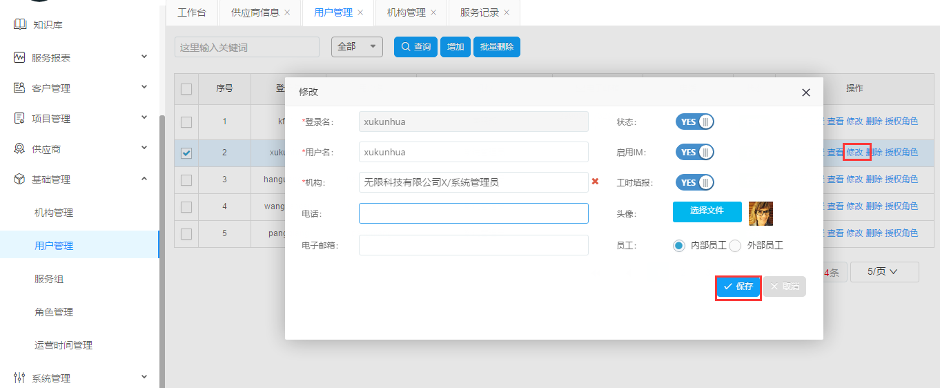 選擇一個用戶,點擊修改。彈出對話框之后修改表單元素,如果確認點擊保存,放棄點擊取消