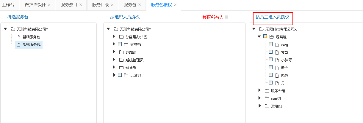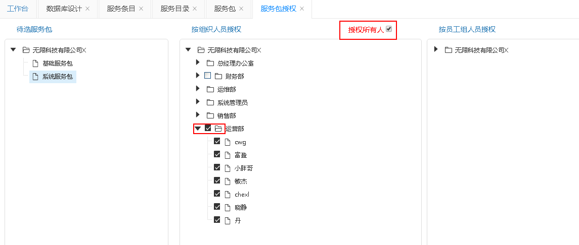 在按組織人員授權(quán)模塊中通過公司機構(gòu)的加載樹選擇員工,或者通過勾選父節(jié)點選中其下所有員工。這里,我們系統(tǒng)提供了一個便捷操作,即勾選授權(quán)所有人就能將服務包授權(quán)給公司里所有人