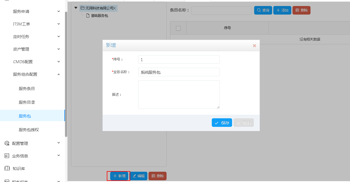 選擇一個節(jié)點,點擊新增。彈出對話框后,填寫序號和業(yè)務名稱,您也可以適當描述一下該服務包,點擊保存