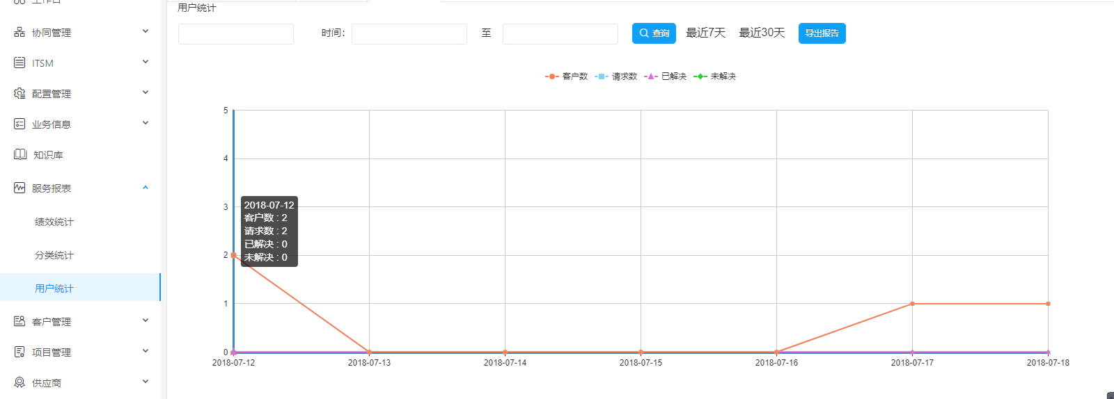 用戶統(tǒng)計主要統(tǒng)計用戶數(shù)與上報問題的數(shù)量,依舊問題的解決情況,包括已解決和未解決。并通過折線圖顯示,使數(shù)據(jù)能夠清晰展現(xiàn)。