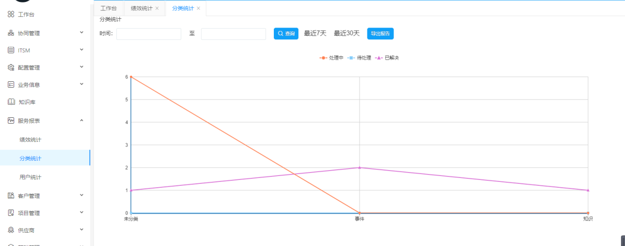 分類統(tǒng)計主要是統(tǒng)計所有工程師處理的工單中,事件和知識工單的情況。并通過折線圖顯示,使數(shù)據(jù)能夠清晰展現(xiàn)。同時,對于大面積問題的預(yù)警也起到了提示作用。根據(jù)折線圖,我們可以看到大部分的問題是什么類型的事件,可以生成問題流程,并通過問題流程來從源頭上解決此事件。