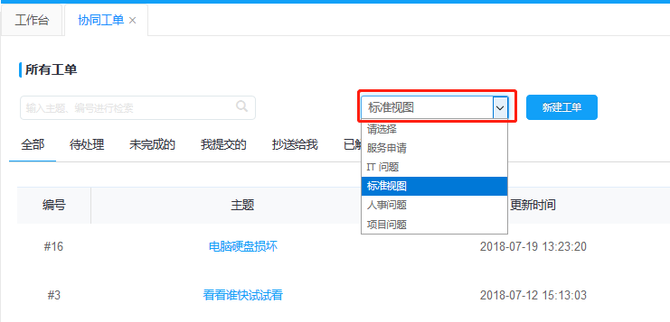 工單隊列分為全部、待處理、未完成、我提交的、抄送給我、已解決,可快速切換標簽查詢到相關(guān)的工單,可同時采用檢索功能查詢需要處理的工單。