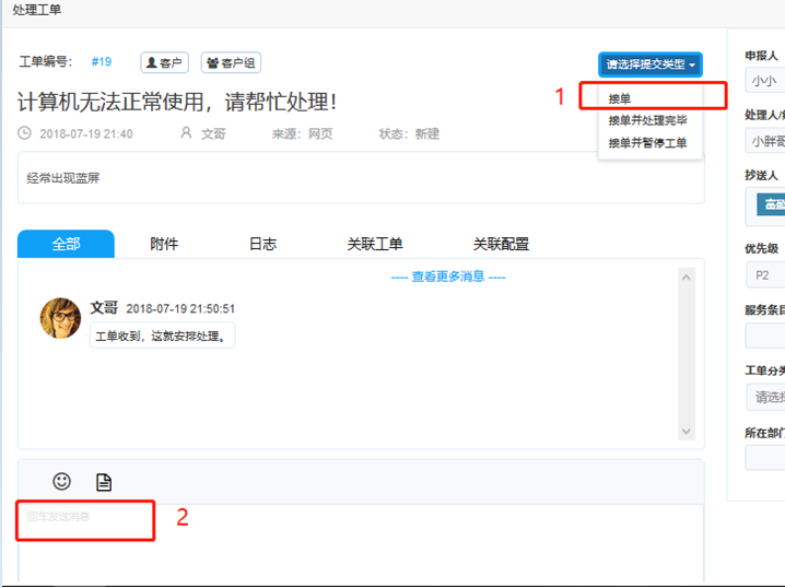 消息區(qū):工單詳情下側(cè)為消息區(qū),輸入消息實時溝通。
