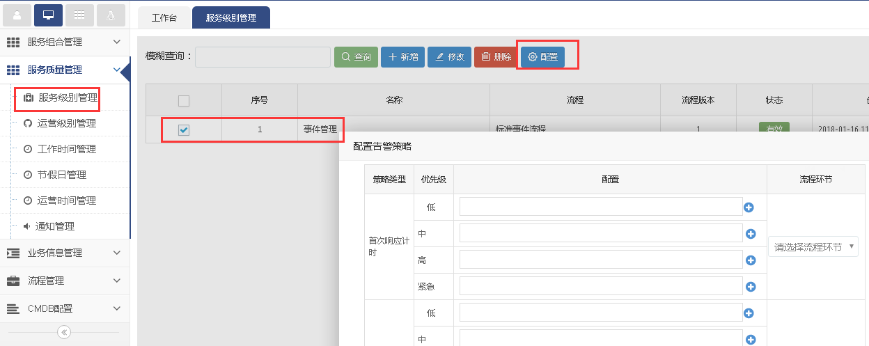 點擊新增。彈出對話框后,填寫名稱(如事件管理),在 流程的下拉框中選擇流程(如事件流程),可適當(dāng)填寫描述,點擊保存。*頁面中的yes代表設(shè)置的這個服務(wù)級別生效。