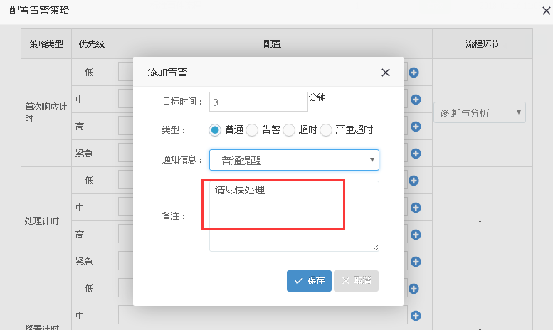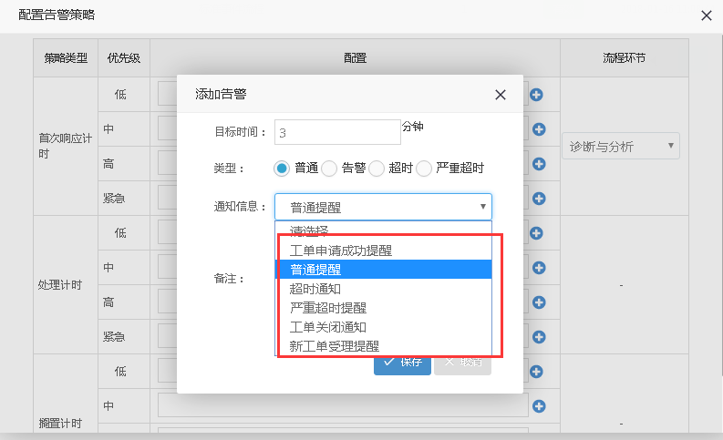 可以進行目標時間填寫,超出指定時間(給怎樣的通知),可以選擇通知的類型,比如普通,選擇通知信息,比如選擇普通信息,還可以備注,處理計時和擱置計時的設(shè)置同首次響應(yīng)計時一樣,唯一不同的是右側(cè)不需要選擇流程環(huán)節(jié)。