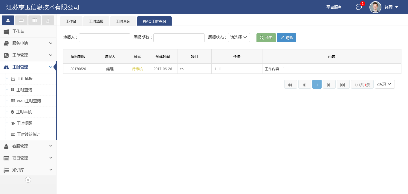系統(tǒng)為提供比部門經(jīng)理和項目經(jīng)理更全的工時數(shù)據(jù)查詢專門開辟了一個菜單:PMO工時查詢。這個菜單不限用戶角色,可以查看所有填報的工時。