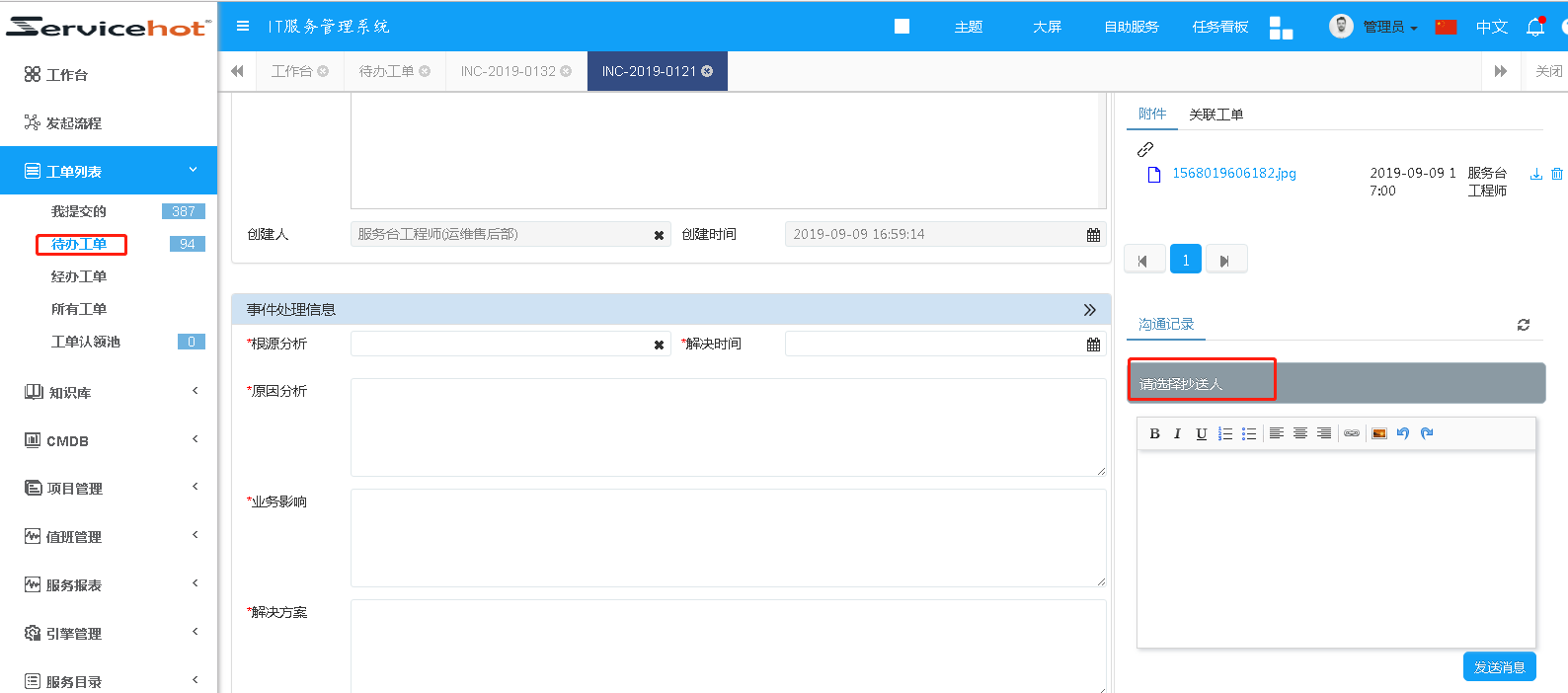 配置方法:工程師找到自己的待辦工單,便可進(jìn)行在線溝通,選擇抄送人等操作。