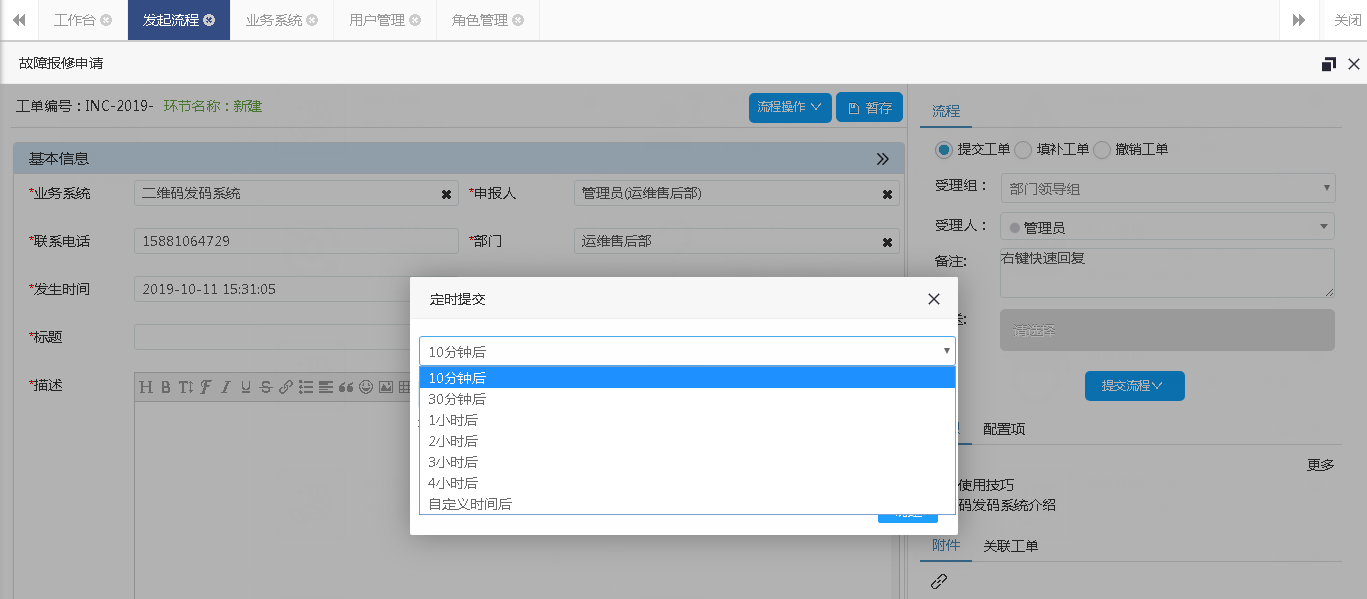 有些工單需要在指定時(shí)間才能提交,比如變更工單要在變更前才能提交,可以提前把頁(yè)面信息填好,時(shí)間設(shè)置好便會(huì)定時(shí)觸發(fā)執(zhí)行。