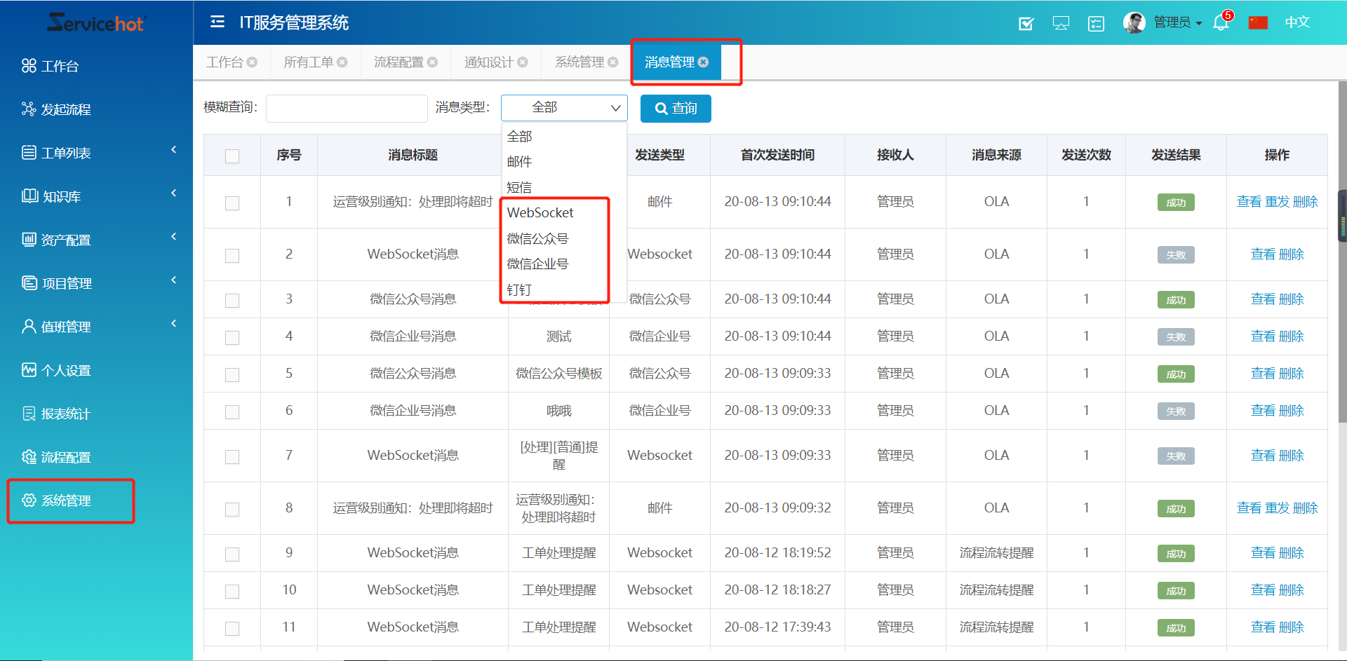 系統(tǒng)新增消息提醒方式,可通過郵件、短信、WebSocket、微信公眾號(hào)、微信企業(yè)號(hào)、釘釘?shù)攘N方式對(duì)用戶進(jìn)行消息提醒,更加多元化,符合不同企業(yè)需求。