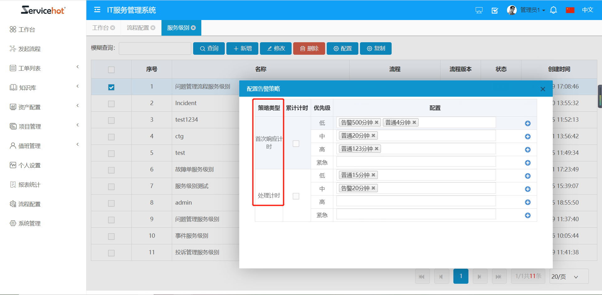 【流程配置-服務(wù)級別】中對服務(wù)級別告警進行配置。
