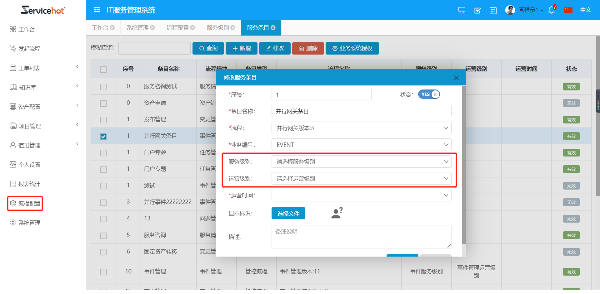 在【流程配置-服務(wù)條目】中選擇已經(jīng)配置好的服務(wù)級別告警。