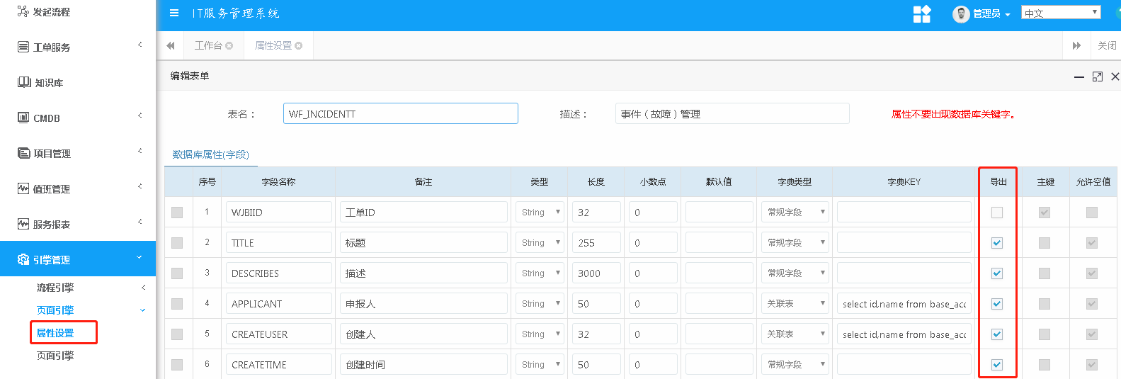 2. 工單自定義導(dǎo)出字段功能,可在設(shè)置頁(yè)面字段的時(shí)候選擇是否導(dǎo)出該字段,