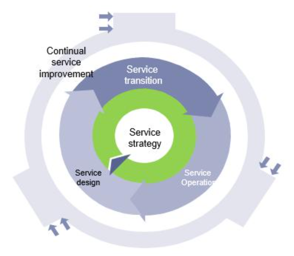 由此可以看出,ITIL 4的設(shè)計(jì)框架和ITIL 2011完全不同。ITIL 2011基于服務(wù)的生命周期,從服務(wù)戰(zhàn)略,服務(wù)設(shè)計(jì)、服務(wù)轉(zhuǎn)換、服務(wù)運(yùn)營(yíng)和服務(wù)的持續(xù)改進(jìn)五個(gè)階段,講解了26個(gè)流程和4個(gè)職能,其框架見(jiàn)下圖。