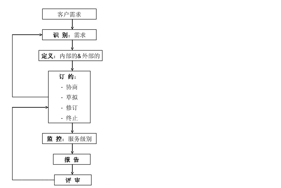 服務(wù)級(jí)別管理:為簽訂服務(wù)級(jí)別協(xié)議SLA而進(jìn)行的計(jì)劃、協(xié)商、監(jiān)控、報(bào)告以及簽訂SLA后對(duì)服務(wù)品質(zhì)的評(píng)價(jià)等活動(dòng)組成的一個(gè)服務(wù)管理