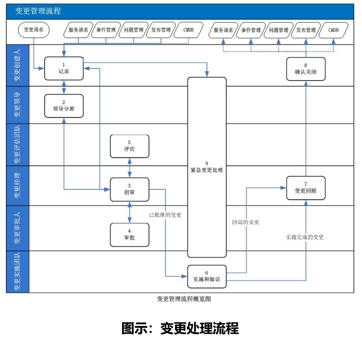變更是IT部門的工作流程,變更管理是指為在最短的中斷時(shí)間內(nèi)完成基礎(chǔ)架構(gòu)或服務(wù)的任一方面的變更而對(duì)其進(jìn)行控制的服務(wù)管理流程,當(dāng)問題管理通過調(diào)查和分析發(fā)現(xiàn)問題產(chǎn)生的根本原因,但不能制定恰當(dāng)?shù)慕鉀Q方案從根本上予以解決時(shí),問題管理需要向變更管理提交變更請(qǐng)求,從而從通過實(shí)施必要的變更從根本上消除問題的根源。變更管理流程是確保在變更實(shí)施過程中使用標(biāo)準(zhǔn)的方法和步驟,盡快地實(shí)施變更,以將由變更所導(dǎo)致的業(yè)務(wù)中斷對(duì)業(yè)務(wù)的影響減小到最低。
