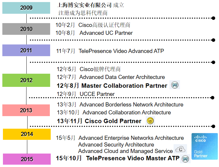從2009年注冊成為思科代理商,僅僅用了4年時間,上海博安就已經(jīng)一躍成為思科金牌代理商。眾所周知,思科共提供了三個合作伙伴認(rèn)證等級,從低到高分別為:高級認(rèn)證代理商、銀牌認(rèn)證代理商和金牌代理商。博安作為思科渠道合作伙伴,其認(rèn)證等級的提升,直接反映了其在關(guān)鍵技術(shù)領(lǐng)域的技能廣度,以及客戶認(rèn)可程度的雙重提升。