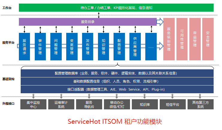 ServiceHot 產(chǎn)品在ITSM領域有數(shù)十年的沉淀,采用成熟的架構自主研發(fā)、提供一體化的IT運維管理功能模塊。本次行業(yè)云ITSOM平臺的推出,勢必改變傳統(tǒng)ITSM軟件市場的方向,改變傳統(tǒng)運維部門的尷尬處境,推進各行業(yè)運維部門從成本中心向利潤中心轉(zhuǎn)變!