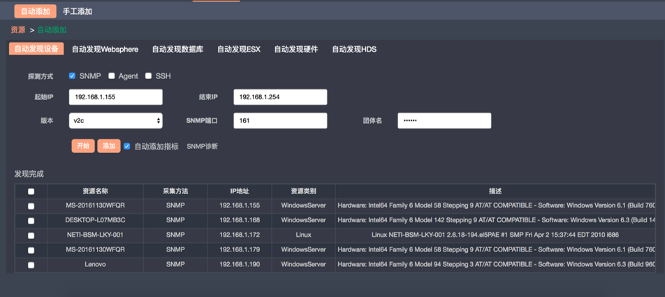 資產(chǎn)檔案管理數(shù)據(jù)不僅僅需要分類明確,對于每類資產(chǎn)信息的展現(xiàn)也需要深入全面,運(yùn)維監(jiān)控系統(tǒng)提供自動發(fā)現(xiàn)配置信息功能,可以發(fā)現(xiàn)絕大部分的資產(chǎn)配置信息,包括網(wǎng)絡(luò)設(shè)備、服務(wù)器、操作系統(tǒng)、PC機(jī)等。