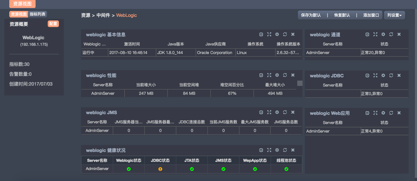 運(yùn)維監(jiān)控系統(tǒng)通過儀表盤、曲線圖等可視化的方式展現(xiàn)被監(jiān)控資源的主要指標(biāo)狀態(tài),如主機(jī)系統(tǒng)、云計(jì)算、weblogic中間件、數(shù)據(jù)庫、服務(wù)器硬件等等,如下圖所示。
