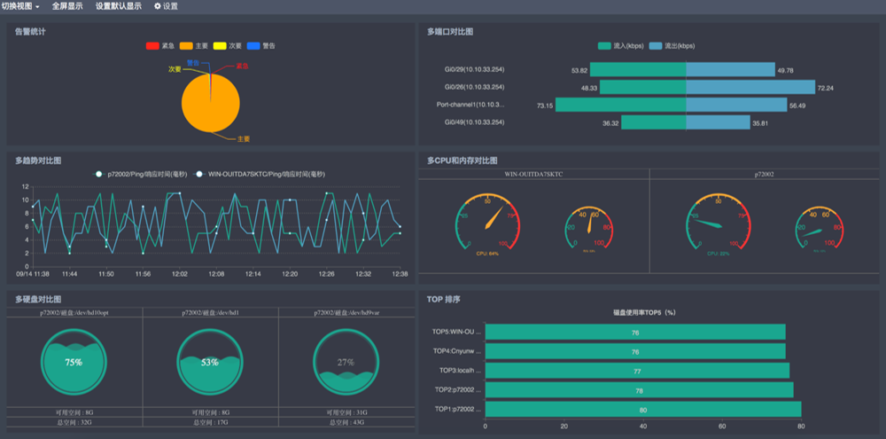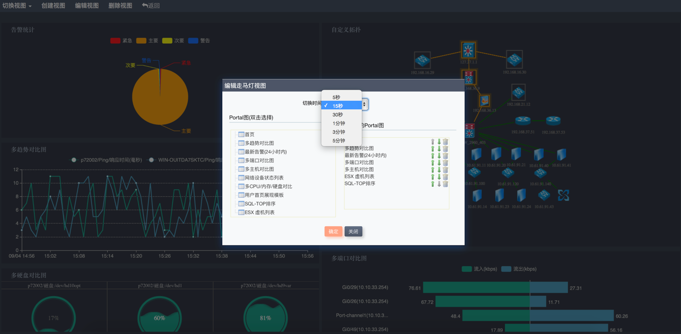 運(yùn)維監(jiān)控系統(tǒng)對于不同用戶創(chuàng)建的自定義Portal視圖,可以通過 “走馬燈”的方式進(jìn)行多Portal視圖的輪詢展現(xiàn)功能。通過對不同的自定義Portal視圖進(jìn)行間隔的切換展現(xiàn),能夠使相關(guān)的人員能夠知道當(dāng)前IT網(wǎng)絡(luò)環(huán)境中所關(guān)注資源的整體運(yùn)行狀態(tài),了解每個部門或者用戶重點(diǎn)關(guān)注的資源實(shí)時狀態(tài),如下圖: