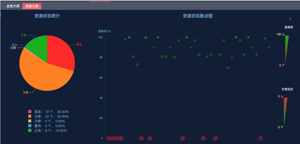 運(yùn)維監(jiān)控系統(tǒng)不僅支持對業(yè)務(wù)健康度的大屏展現(xiàn),而且提供了資源的全局狀態(tài)展現(xiàn)。資源狀態(tài)統(tǒng)計(jì)能匯總監(jiān)控系統(tǒng)中全部的資源情況,并且可以通過餅圖統(tǒng)計(jì)出各類告警級別的資源占比。運(yùn)維監(jiān)控系統(tǒng)特有的資源狀態(tài)散點(diǎn)圖,能以動態(tài)方式呈現(xiàn)海量資源健康狀態(tài)分布,方便運(yùn)維人員從全局觀看資源健康情況。