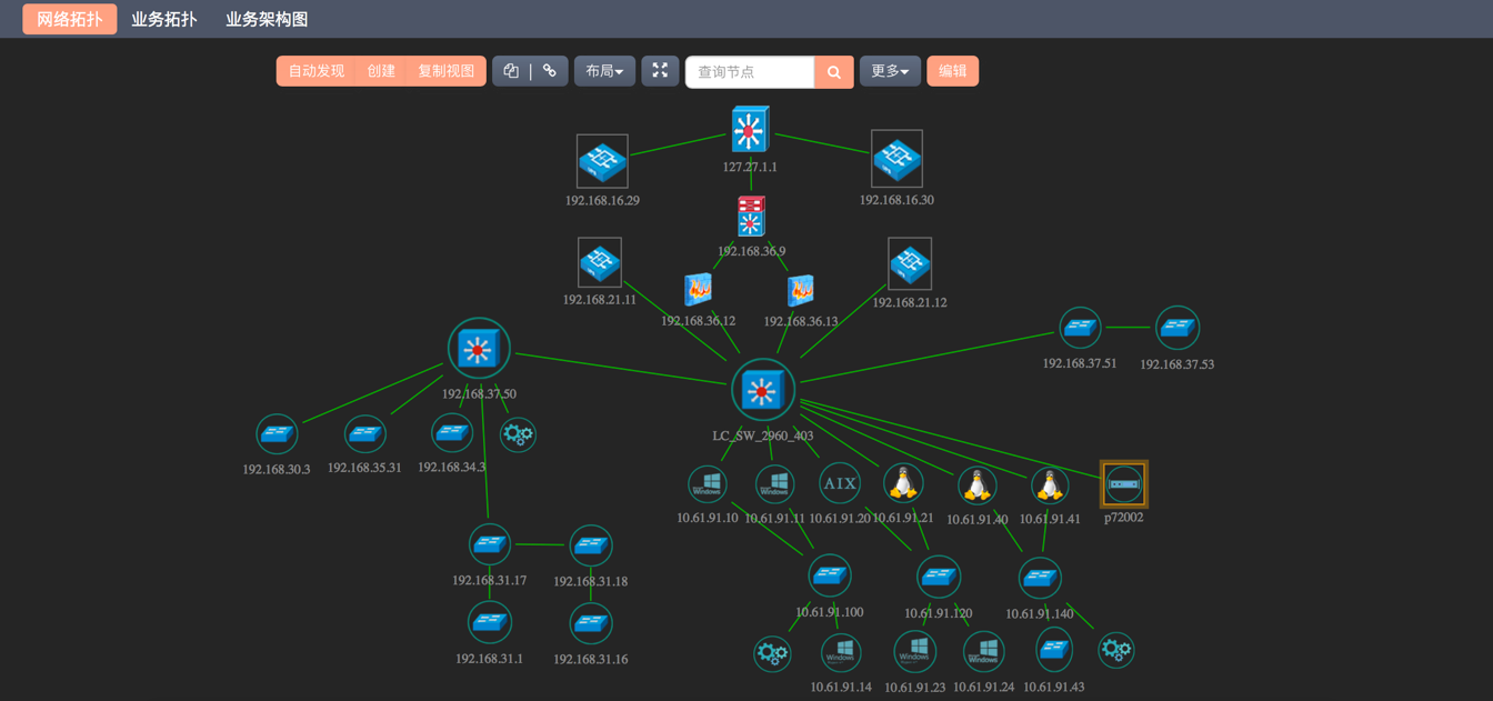 運(yùn)維監(jiān)控系統(tǒng)提供了自動發(fā)現(xiàn)拓?fù)涔δ?,能夠發(fā)現(xiàn)全網(wǎng)拓?fù)?、指定網(wǎng)段拓?fù)?、路由拓?fù)?,能夠自動關(guān)聯(lián)系統(tǒng)已經(jīng)監(jiān)控的設(shè)備的狀態(tài)在拓?fù)鋱D上實(shí)時顯示。系統(tǒng)還支持自定義拓?fù)涔δ埽芾韱T可以自行增加各種管理視圖,并以可視化圖形的方式展現(xiàn)各種管理視圖。每個管理視圖都將展現(xiàn)不同資源之間的關(guān)系、資源的當(dāng)前狀態(tài)和告警報(bào)警情況。每個管理視圖也可以設(shè)置不同的標(biāo)題和背景圖。在自定義拓?fù)漤撁婺軌蝻@示拓?fù)湓氐母婢畔⒑唾Y產(chǎn)信息等數(shù)據(jù)。