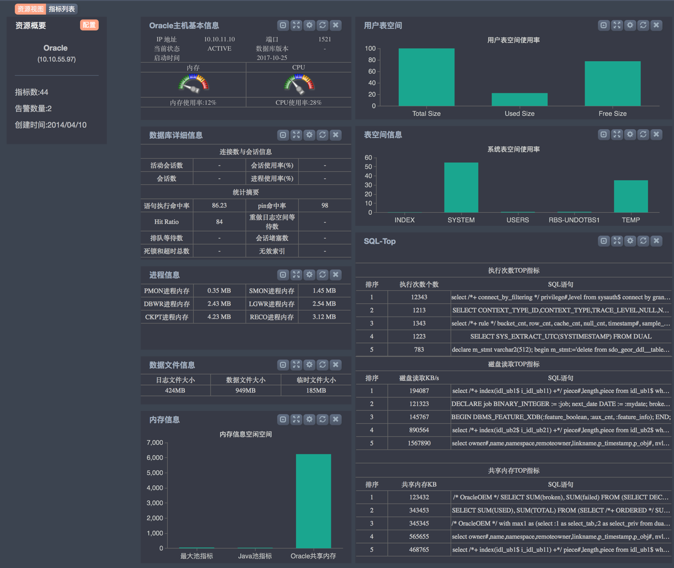 運(yùn)維監(jiān)控系統(tǒng) 通過JDBC,對主流數(shù)據(jù)庫進(jìn)行監(jiān)測,包括Oracle、Oracle RAC、DB2、SQL Server、Mysql、達(dá)夢數(shù)據(jù)庫等,能夠監(jiān)控?cái)?shù)據(jù)庫關(guān)鍵性能指標(biāo),如表空間、鎖狀態(tài)、會話狀態(tài),并且能夠把占用數(shù)據(jù)庫資源較多的SQL語句進(jìn)行排序,方便管理員查找數(shù)據(jù)庫瓶頸。