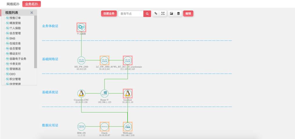 底層的設(shè)備故障直接影響到上層業(yè)務(wù)的運(yùn)行,通過業(yè)務(wù)拓?fù)湟晥D,解決了故障定位不清晰,層級依賴不清晰的問題,為“自上而下”排查故障提供依據(jù);