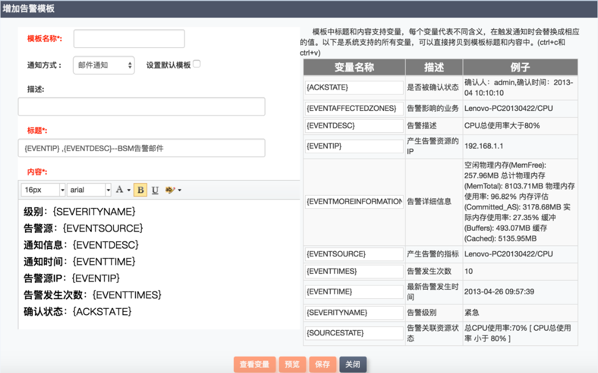 監(jiān)控系統(tǒng)提供默認(rèn)的告警通知模板,也可以靈活的手動設(shè)置告警通知模板,完全自定義設(shè)定通知的具體信息,方便發(fā)送郵件或短信,直接選擇填寫的模板就可以。