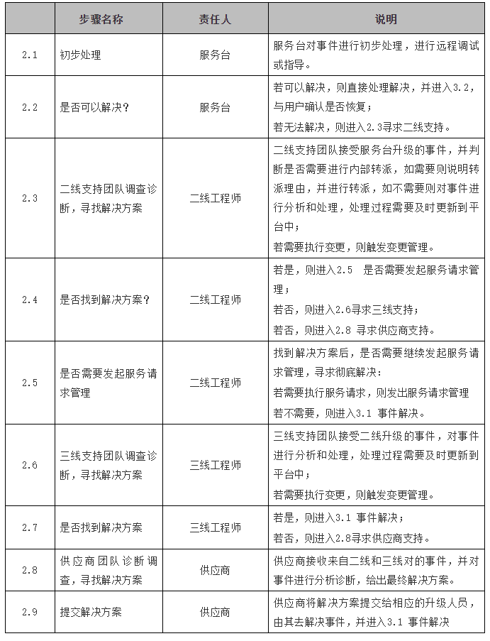 整體流程總共三大階段:識別記錄、調(diào)查診斷、解決關(guān)閉,各階段詳細說明如下: